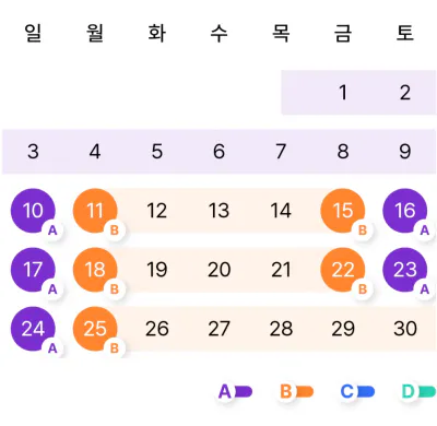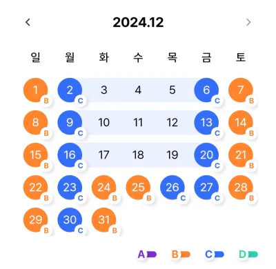 ▶아래는 시즌별 달력입니다. 가격은 A-B-C 순으로 저렴해집니다. C가 가장 저렴합니다.